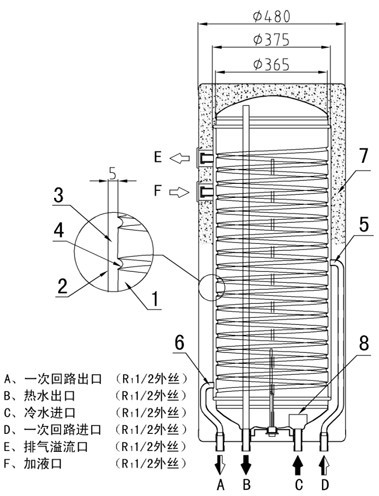 由于水箱蓄热内胆内冷水加热时液体流动方向是由下向上运动,将水箱换热进出管道设计成180度逆流循环换热方式,热流体介质由换热壁面上部流入,经过180度换热通道,再由换热壁面下部流出,在同样流体进出温度情况下,冷热流体平均温差是最大的,起到强化换热的作用。
