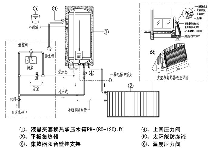 ◆ 水箱容量100L;配置1块平板集热器1.84m2;