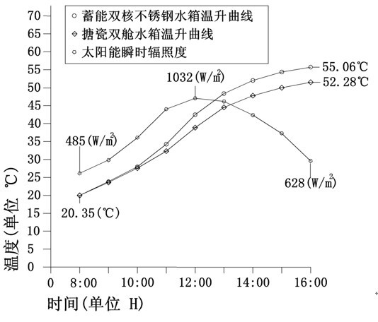 以上测试都符合家用分体双回路太阳能热水系统热性能6.6MJ/m2要求。同时可以看出配置蓄热双核不锈钢承压水箱热水系统比配置搪瓷双舱承压水箱热水系统的日有用得热量明显提高10%左右。
