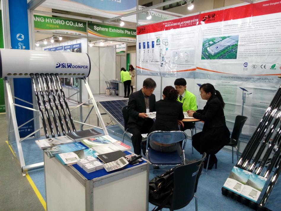 此次展会上,我司根据韩国市场需求,分别展出了热管集热器、真空管集热器、承压直换式热水器、立式夹套热泵水箱和微型并网系统等产品。新颖的设计、多样的展出方式,吸引了众多客人驻足参观,纷纷上来洽谈咨询。展会期间我司参展人员会见了Westech、 LG、H2 Energy、Daeshin Snb Co.,ltd、Time Consultants & Engineering Co.,Ltd、HYUKSIN E&C Co.,Ltd等韩国本土太阳能相关产品生产商,以及G&G、HWA SUNG TRADING COMPANY等海外采购商,并根据客户不同的需求展示了热水系统和发电系统解决方案,让客户体验到我司以客户为中心的贴心服务。先后与 Westech、G&G、Daeshin Snb Co.,ltd、HWA SUNG TRADING COMPANY等公司达成了合作意向。