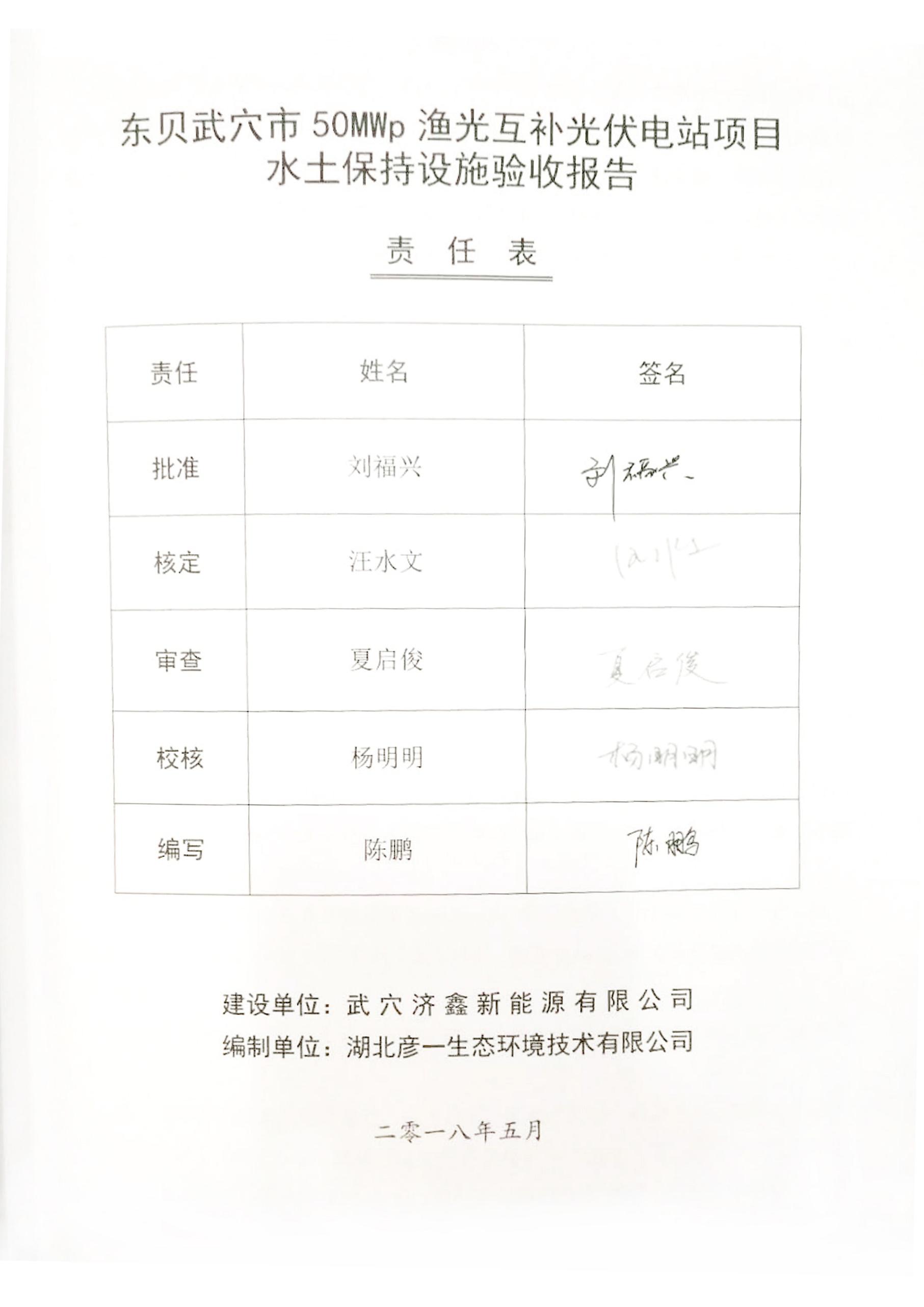 经建设单位对本工程水土保持设施进行自查自验,认为本工程水土保持设施从技术上达到了竣工验收条件和要求,特编写了《东贝武穴市50MWp渔光互补光伏电站项目(水土保持设施)验收报告》。
