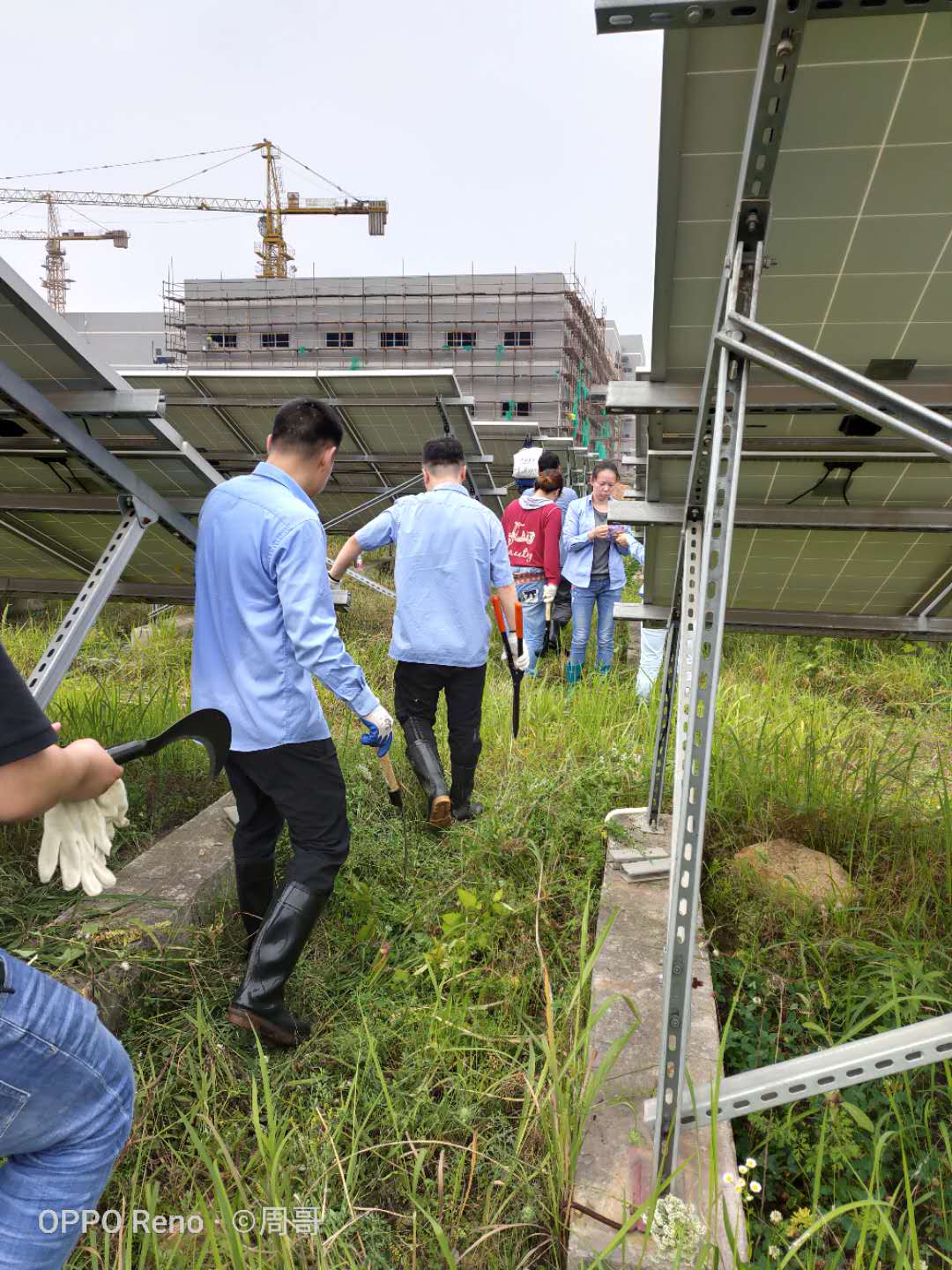 早晨8点半钟,60多名管理人员按时抵达项目现场。经过简短的分组和安全交底后,大家在四位组长的带领下迅速进入沪士电子厂区内,开始了除草工作。一进入光伏区内,大家都鼓足干劲,热火朝天的干了起来。由于前几天下雨,很多区域有较深积水,部分党员和男同志都主动请命前往水深的区域除草。公司安全员在光伏区内巡视,提醒大家注意安全,特别是镰刀作业区域内不允许有其他人靠近。