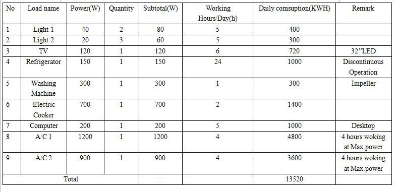 KW System Loading Power and Daily Power Consumption Table