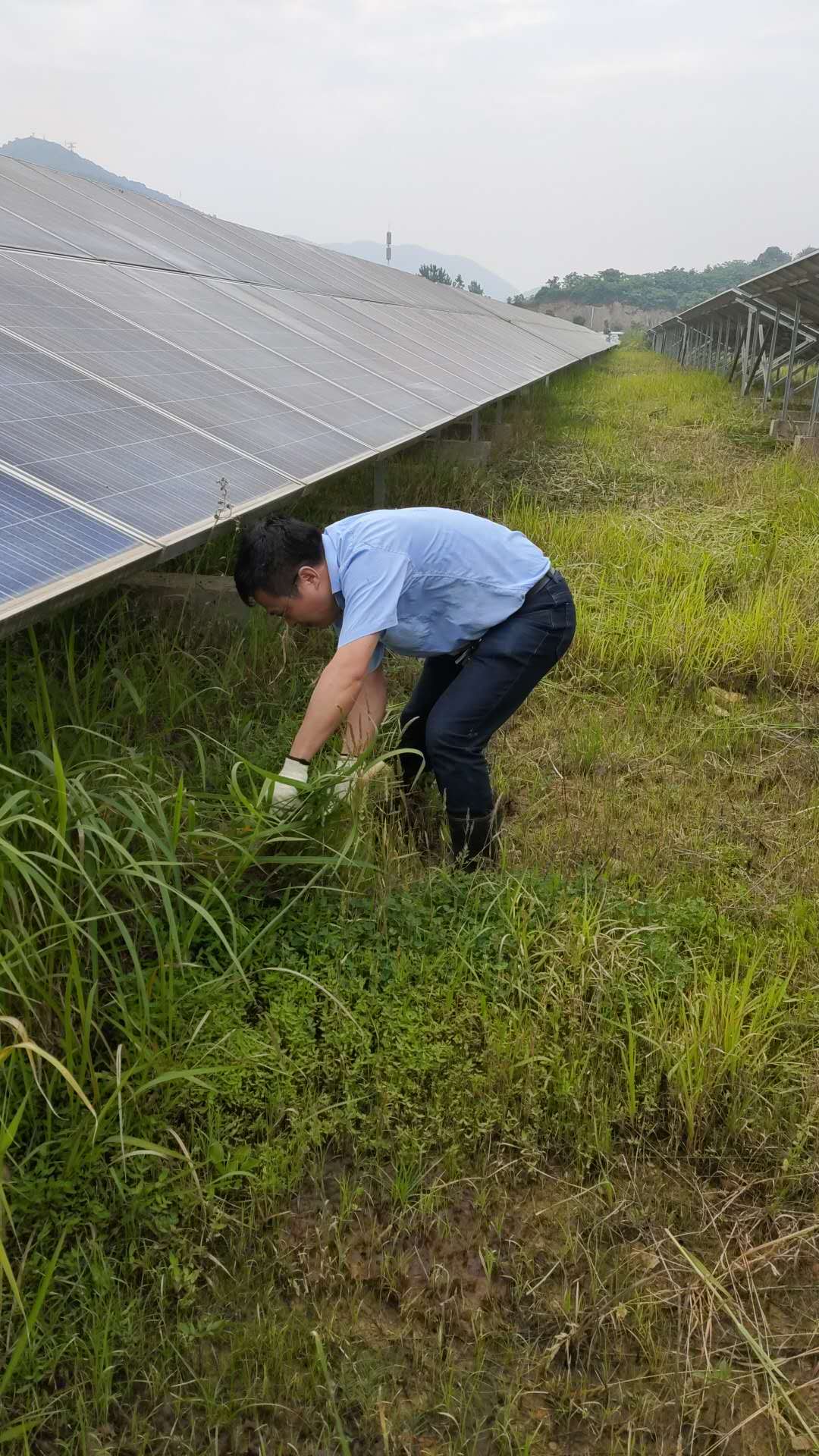 经过几个小时的除草,大家都是汗流浃背,但是努力劳动的成果是显著的,光伏区域已经将高过电池板的杂草全部清理干净,地面上到处都铺满了割掉的杂草。除草完成后,队长号召大家将带进来的水瓶等杂物带出光伏区。广阔的光伏区域一眼望去,通透而又美丽。