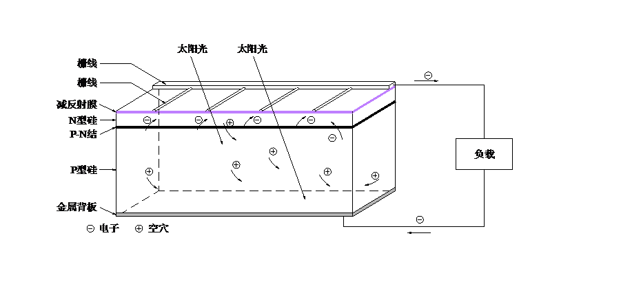 半导体具有将吸收的光子的部分能量传递给电流载体(电子、空穴)的特性。我们将太阳能电池吸收光能产生的电子和空穴称作光生载流子。P-N结及两边产生的光生载流子就被内建电场所分离,在P区聚集光生空穴,在N区聚集光生电子,从而使P区带正电,N区带负电,同时在P-N结两边产生光生电动势。我们将这个效应称作光生伏特效应或光伏效应。当太阳能电池的两个电极接通时就会产生电流。