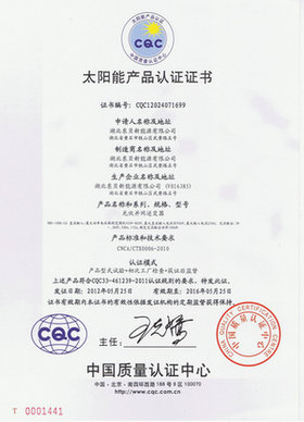 “CQC”产品认证是被国家“金太阳工程”及国家太阳能光伏电站招标等大型光伏电站项目认可的唯一认证,并可申请国家金太阳工程补贴,亦可作为其它工程招标的认证依据。目前金太阳认证已经成为太阳能光伏行业高标准、高品质的产品象征,成为太阳能光伏企业的技术实力的标志。此认证表明该产品具有满足顾客要求和适用法规要求的能力,与同类产品相比,该产品的各项性能参数已达到了国际标准,能持续稳定地向顾客提供预期和满意的优质产品。